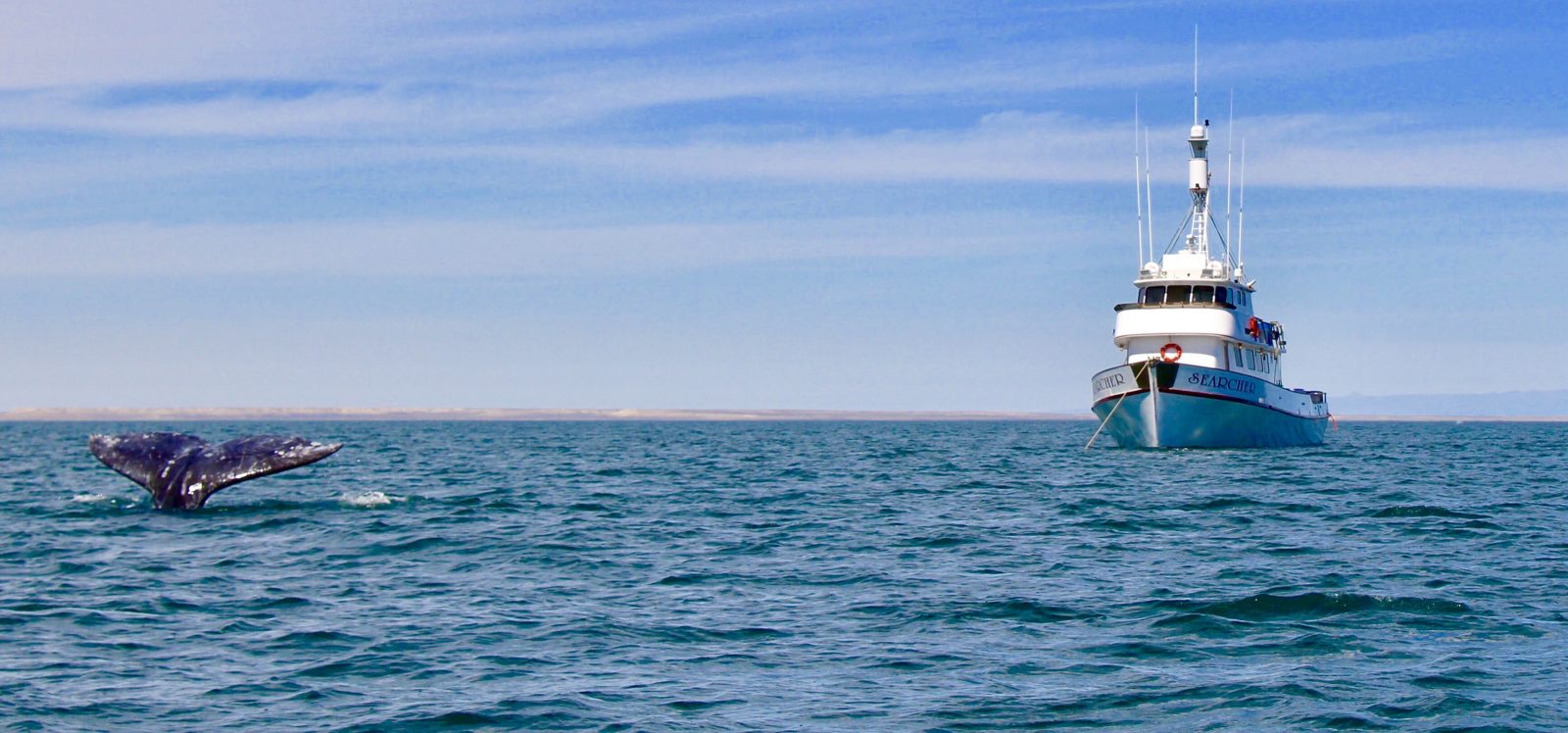 We had a windy transit from Isla San Benitos to Laguna San Ignacio, but here were lots of gray whales in the entrance to the lagoon to greet us. Everyone had an opportunity to take a panga ride to visit the gray whales this morning. A few people had a close encounter with a cow and calf, and everyone else had good whale watching. After lunch with the wind increasing, we decided to take advantage of the high tide and make a trip into the mangroves. The trip into the mangroves was a success with lots of birds seen. Everyone enjoyed their visit. In addition, the group went ashore and looked at the dead gray whales on the beach. We have a group of veterinarians with us this trip, and so they were interested in seeing the whale. Here is a photo of a curious whale approaching the bow of Searcher.